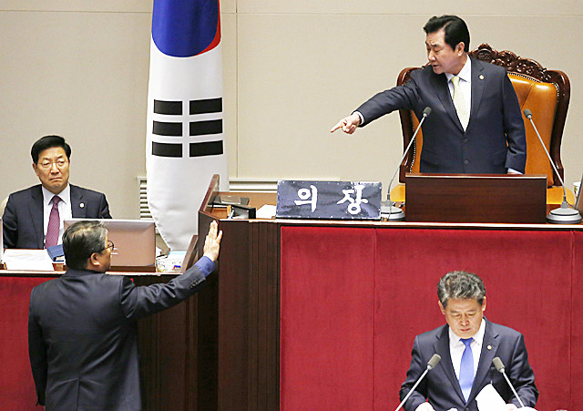 새누리당 조원진 원내수석부대표가 26일 새벽 국회에서 열린 테러방지법 처리 저지를 위한 더불어민주당 김경협 의원의 무제한 토론 도중 이석현 국회부의장에게 김 의원의 발언이 의제와 벗어났다고 항의를 계속하자 이 부의장이 의사 진행을 방해하고 있다며 설전을 벌이고 있다.