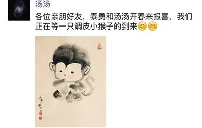 탕웨이는 이 글과 함께 자신의 아버지가 그린 아기 원숭이 그림도 공개해 붉은 원숭이 띠인 올해 출산 예정임을 암시했다.