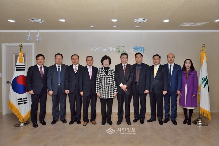 박춘희 송파구청장은 최근 구청장실에서 중국 산동성 연태시 지부구 무슈칭 서기를 비롯한 7명의 방문단을 접견했다. 사진은 박춘희 구청장(왼쪽에서 다섯 번째)이 관계자들과 기념촬영을 하는 모습.(사진제공=송파구청)