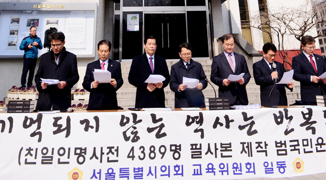 서울시의회의 친일인명사전 4389명 필사본 제작 범국민운동에 돌입한 29일 오후 서울특별시의회 앞에서 박래학(왼쪽 세번째부터) 서울시의회 의장을 비롯한 김문수 시의회 교육위원장 등 시의원들이 성명서를 낭독하고 있다. 이번 범국민운동은 역사를 공정하게 기록하고 평가하며 가슴깊이 기억해 잘못된 역사를 반복하지 않기 위해 마련됐으며 친일인명사전에는 일제의 식민통치와 전쟁에 협력한 4389명의 구체적인 반민족행위 등에 대한 내용이 수록됐다.