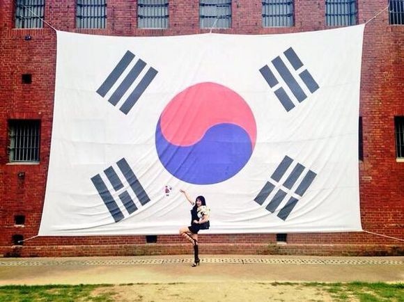 공개된 사진 속 낸시랭은 커다란 태극기 앞에서 낸시랭 특유의 포즈를 취해보였다. 낸시랭은 작은 태극기를 흔들며 다리 하나를 올린 이색 포즈를 선보였다.