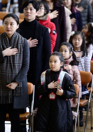 전국 초등학교에서 일제히 입학식이 열린 2일 오전 서울 용산구 이태원초등학교에서 1학년 신입생 어린이들이 국민의례를 하고 있다.