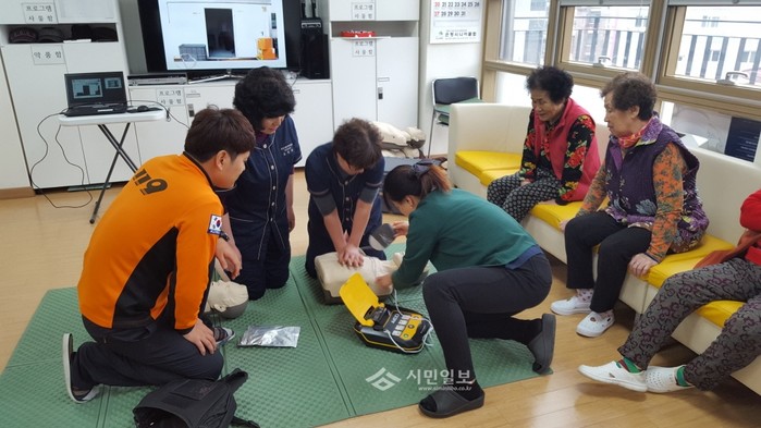 지난 2일 은평소방서는 구산데이케어센터를 방문해 소속직원 및 노인 30여명을 대상으로 '소방안전교육'을 실시했다. 사진은 소방관이 센터 직원들에게 심폐소생술 실습을 진행하는 모습.(사진제공=은평소방서)