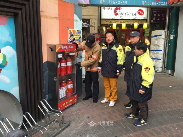 최근 인천중부소방서 중앙119안전센터는 신포시장에서 의용소방대 정기교육을 실시했다. 사진은 소방서 관계자가 의용소방대원들에게 비상소화전함 사용 실습교육을 하는 모습.(사진제공=인천중부소방서)