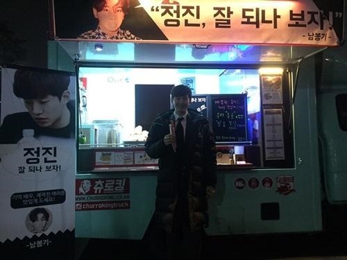사진 속 준호는 커피와 간식차 앞에서 환한 미소를 짓고 있다. 커피차에는 ‘정진, 잘 되나 보자’라는 문구와 함께 ‘남봉기’란 별칭이 담겨져 있어 눈길을 끈다. 이는 동시간대 첫 방송되기 때문인 것으로 알려졌다.