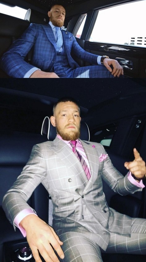 맥그리거는 이동하는 차안에서 전혀 다른 색감의 정장을 모두 소화한 사진으로 경기 때와는 다른 매력을 과시했다.