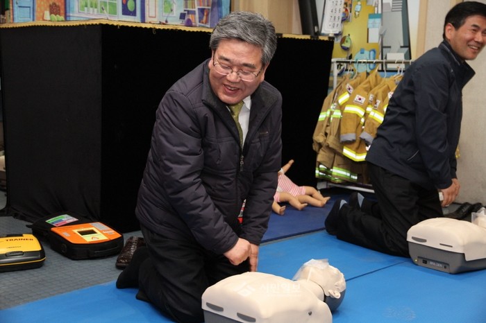 지난 4일 동작소방서는 3층 소방안전교육실에서 기상청 직원을 대상으로 다양한 '응급처치 교육'을 실시했다. 사진은 고윤화 기상청장(가운데)이 심폐소생술 실습을 진행하는 모습.(사진제공=동작소방서)