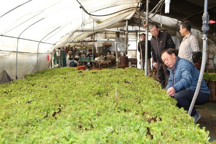 지난 4일 김성기 경기 가평군수는 특작, 시설채소, 농산물 가공농가 등 농업현장 실태를 파악하기 위한 방문체험을 실시했다. 사진은 김 군수(오른쪽)가 두릅재배농가를 방문해 두릅을 살펴보고 있는 모습.(사진제공=가평군청)