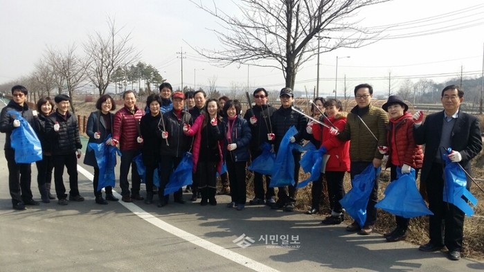 지난 4일 경기 김포시 풍무동 주민자치위원회가 3월 정례회의 후 최근 동 주민의 이용률이 증가하고 있는 계양천 산책로 일원에서 환경정화 활동을 펼쳤다. 사진은 관계자들이 기념촬영을 하는 모습.(사진제공=김포시청)