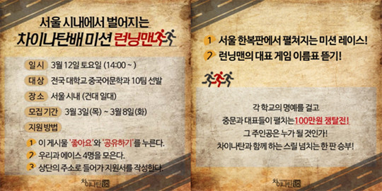 실제로 중국어회화 교육업체 차이나탄에서 전국 대학교 중국어문학과 학생을 대상으로 차이나탄배 런닝맨을 진행한다고 밝혔다.