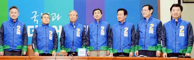 더불어민주당 김종인 비상대책위원회 대표와 이종걸 원내대표를 비롯한 위원들이 7일 오전 서울 여의도 국회에서 열린 비상대책위원회의에 앞서 선거운동복을 선보이고 있다.