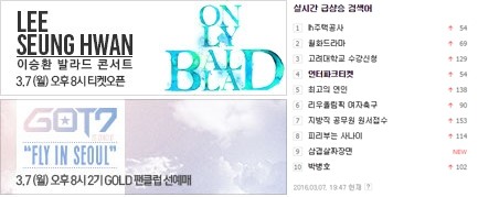 오늘(7일) 7시 40분경 인터파크 티켓과 서버시간이 함께 검색어에 올랐다. 이는 8시 예정된 GOT7(갓세븐)의 콘서트와 이승환의 콘서트 때문. 두 가수의 인기가 입증되는 순간이었다.