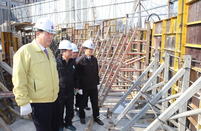 | ▲ 지역내 공사현장을 찾아 관계자들과 안전점검을 진행 중인 조길형 영등포구청장(왼쪽)의 모습. | ||