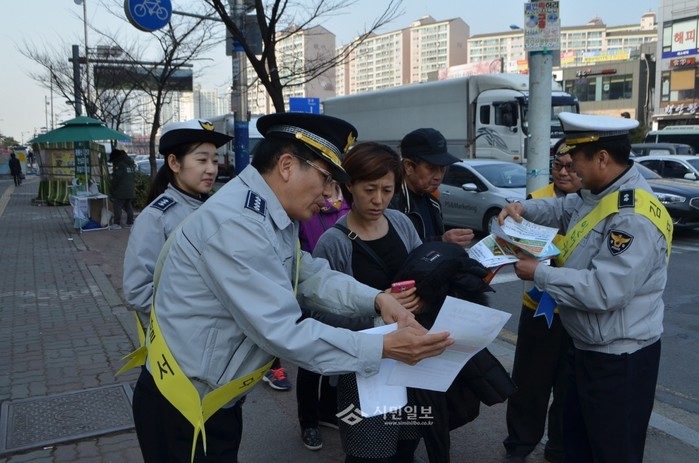 최근 경기 김포경찰서는 '제240차 안전점검의 날'을 맞아 장기동 신한프라자 앞 사거리에서 유관기관·협력업체 합동으로 '안매켜소 운동' 캠페인을 실시했다. 사진은 이봉행 김포경찰서장(왼쪽)이 시민에게 전단지 내용을 설명하고 있는 모습.(사진제공=김포경찰서)