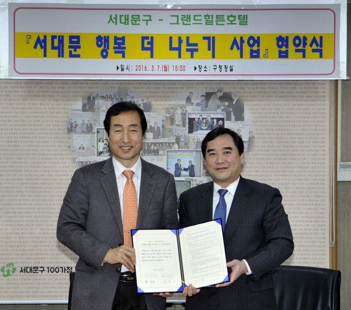 지난 7일 서대문구는 구청장실에서 그랜드힐튼호텔과 사회복지시설과 저소득주민에 비품, 의류 등 호텔 교체물품을 제공하는 '서대문 행복 더 나누기 사업' 협약을 맺었다. 사진은 문석진 구청장(왼쪽)과 이윤기 그랜드힐튼호텔 대표가 기념촬영을 하고 있는 모습.(사진제공=서대문구청)