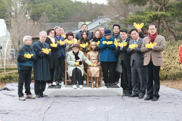 지난 8일 복기왕 충남 아산시장은 ‘평화의소녀상 아산건립추진위원회’가 주최하는 ‘평화의 소녀상 제막식’ 행사에 참석했다. 사진은 복기왕 시장(오른쪽에서 세 번째)과 위안부 할머니 등 관계자들이 기념촬영을 하는 모습.(사진제공=아산시청)