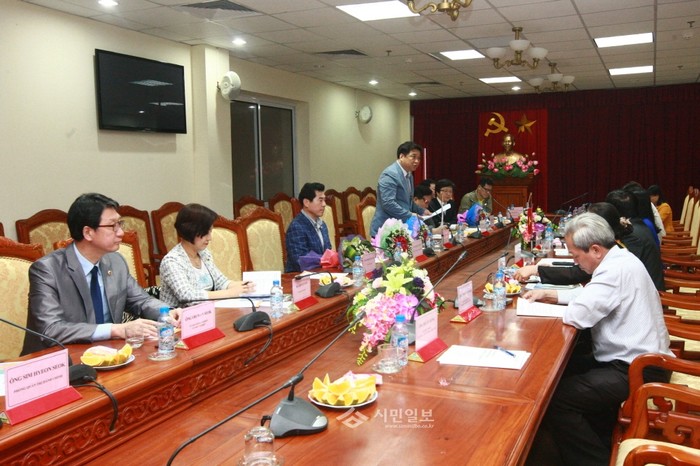 지난 8일 베트남 응헤안성 친선의원연맹 회장 김호겸 경기도의회 의원(더불어민주당·수원6)을 비롯한 도의원 9명은 한국-베트남 기술 전문학교를 방문해 응엔 유이남 총장을 접견하고, 한국어학과 학생들을 위한 아동도서 기증행사를 가졌다. 사진은 관계자들이 대화하는 모습.(사진제공=경기도의회)