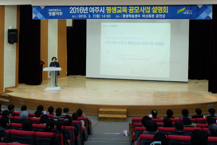지난 7일 경기 여주시 평생학습센터는 지역평생교육 활성화를 위해 2016년 평생교육 공모사업 설명회를 평생학습센터 여성회관 공연장에서 개최했다. 사진은 관계자가 공모사업에 대해 설명하고 있는 모습.(사진제공=여주시청)