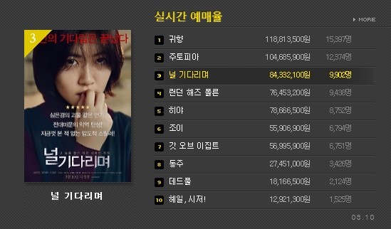 '널 기다리며'가 스릴러 장르에 청소년 관람불가 등급 판정을 받았음 에도 불구하고 예매율 3위를 기록한 것은 의미가 있다.