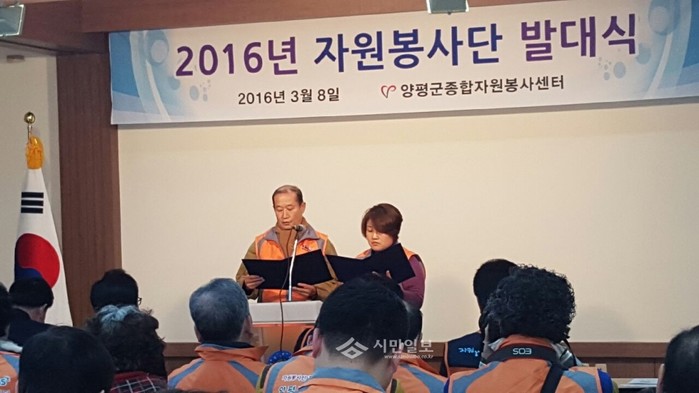 지난 8일 경기 양평군종합자원봉사센터는 보건소 3층 회의실에서 자원봉사자 70여명이 참석한 가운데 2016년 자원봉사단 발대식을 개최했다. 사진은 행사 관계자들이 발대식을 진행하고 있는 모습.(사진제공=양평군청)