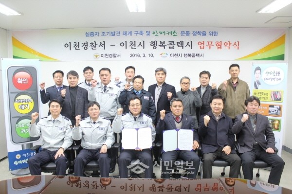 최근 경기 이천경찰서는 이천시 행복콜택시와 치매노인 실종시 경찰과 행복콜택시가 업무협조를 통해 신속·안전하게 실종자를 발견하는 것을 골자로 업무협약을 체결했다. 사진은 김균 서장(앞줄 왼쪽에서 세 번째)과 관계자들이 기념촬영을 하는 모습.(사진제공=이천경찰서)
