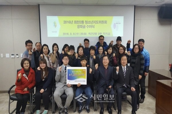 최근 경기 양주시 회천2동 청소년지도위원회는 회천 2동 복합청사 3층 회의실에서 덕계고 학생 4명에게 120만원 상당의 장학금을 전달했다. 사진은 황영희 양주시의회의장(앞줄 맨 오른쪽)과 관계자들이 기념촬영을 하는 모습.(사진제공=양주시청)