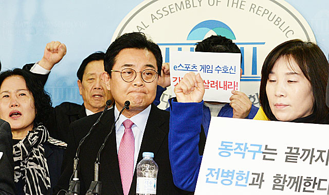 더불어민주당 전병헌 의원이 자신의 공천 배제와 관련, 당 공천관리위원회에 재심 신청서를 제출한 뒤 13일 오전 서울 여의도 국회 정론관에서 기자회견을 하고 있다. 옆으로는 지지자들이 구호를 외치고 있다.