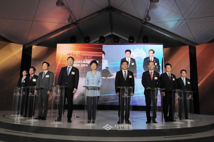 | ▲ SK하이닉스 M14 반도체공장 준공 및 미래비전 선포식에 박근혜 대통령(가운데)과 최태원 SK 회장 등의 내빈들이 참석한 모습. | ||