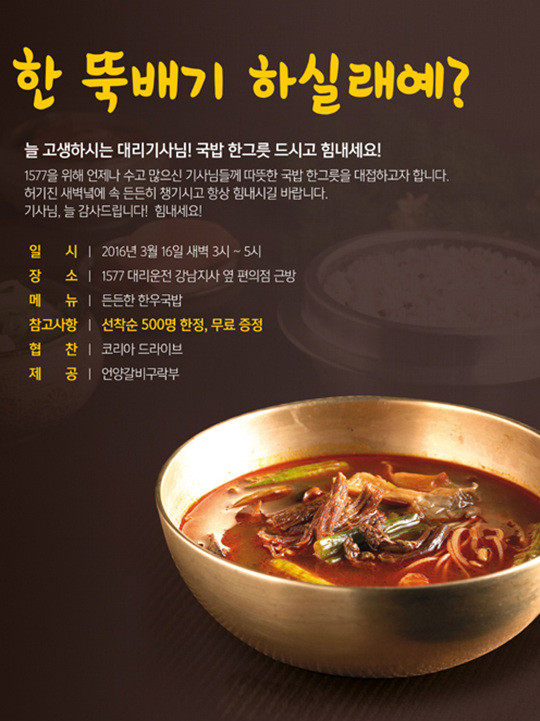 [시민일보=김다인 기자]신동엽의 대리운전 코리아드라이브에서 3월16일 새벽 3시부터 5시까지 대리운전 기사에게 든든한 한우 국밥을 제공한다고 14일 밝혔다.