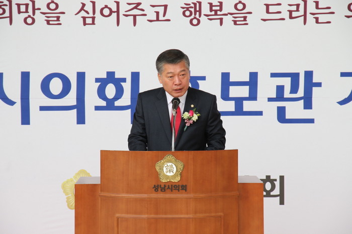 | ▲박권종 성남시의회 의장이 시청 광장에서 열린 시의회 홍보관 개관식에서 인사말을 전하고 있다. | ||