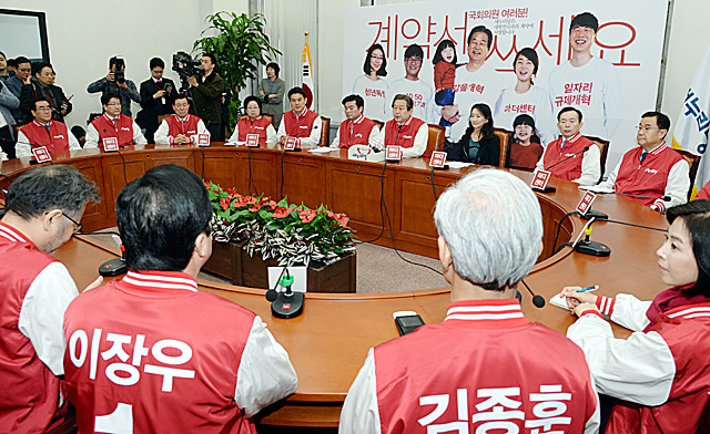 김무성 대표가 14일 오전 국회에서 열린 새누리당 최고위원회의에서 핵심 5대 공약으로 ▲갑을개혁 ▲규제개혁 통한 일자리 창출 ▲청년 위한 마중물 ▲중장년 일자리 마련 ▲한국식 마더센터 마련 등을 제시하고 있다.