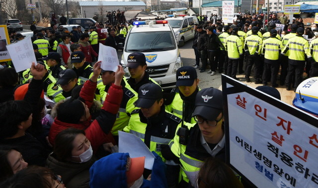 평택 실종 예비 초등생 故신원영군 암매장 사건의 현장검증이 진행된 14일 오후 경기도 평택시 포승읍의 피의자 친부 신모씨(38)와 계모 김모씨(38)을 태운 차량이 주차장으로 들어가고 있다.