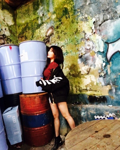 현아는 공개된 사진 속에서 편안한 의상과 워커를 매치 후 드럼통을 드는 포즈를 취하고 있다. 현아의 늘씬한 각선미가 돋보인다.