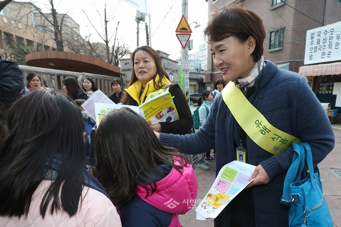 지난 14일 성북구는 어린이의 건강과 안전을 위해 그린푸드존내 기호식품 판매업소 502곳과 그린푸드표지판 90개를 대상으로 일제 지도·점검을 실시했다. 사진은 어린이기호식품 전담 관리원들이 어린이들에게 전단지를 배부하는 모습.(사진제공=성북구청)