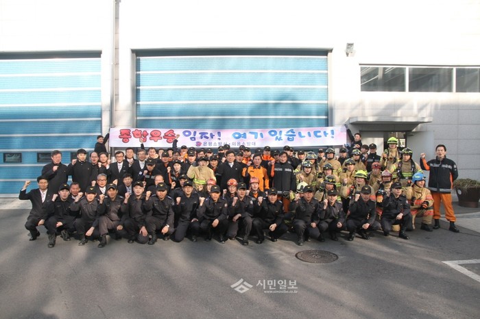 15일 서울 은평소방서는 2016년 소방기술 경연대회 종합우승을 위한 선수단 발대식을 열었다. 사진은 발대식에 참석한 관계자들이 기념촬영을 하는 모습.(사진제공=은평소방서)