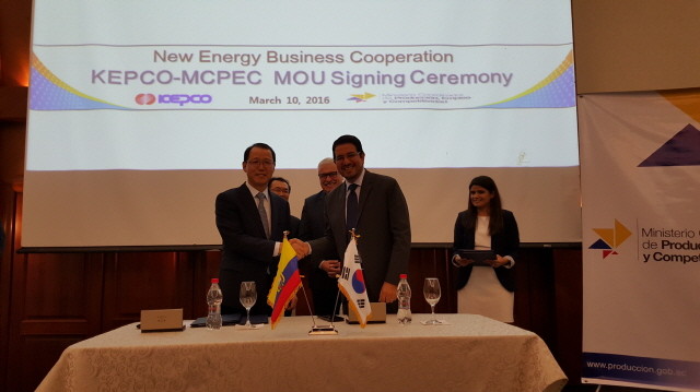 [시민일보=여영준 기자]한국전력(사장 조환익)은 지난 10일 현지시간 오전 10시30분(한국시간 3월11일 오전 12시30분) 에콰도르의 수도 키토 스위스호텔에서 에콰도르 정부, 기재부, 산업부 및 국내기업 관계자 등 100여명이 참석한 가운데 ‘한전-에콰도르 생산고용경쟁력조정부(MCPEC) 간 에너지 신산업 분야 기술협력 MOU’를 체결했다.