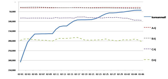 | ▲ 그래프 설명 : 국내 주요 역직구몰 알렉사 랭킹 현황 | ||