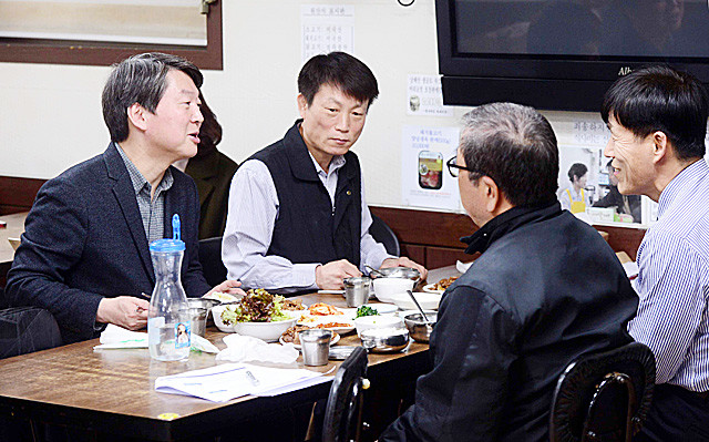 국민의당 안철수 상임공동대표가 15일 서울 마포구 연남동 한 식당에서 택시기사들과 식사를 하며 간담회를 하고 있다.