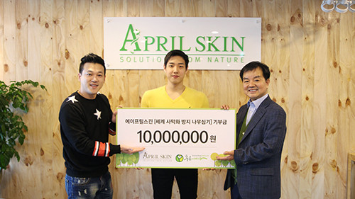 | ▲ 에이프릴스킨 이주광 공동대표(가운데)가 (사)푸른아시아 오기출 사무총장(우)에게 지난 8일 미세먼지 방지를 위한 세계 사막화 방지 나무심기 기금을 전달하고 있다.(사진제공=에이프릴스킨) | ||