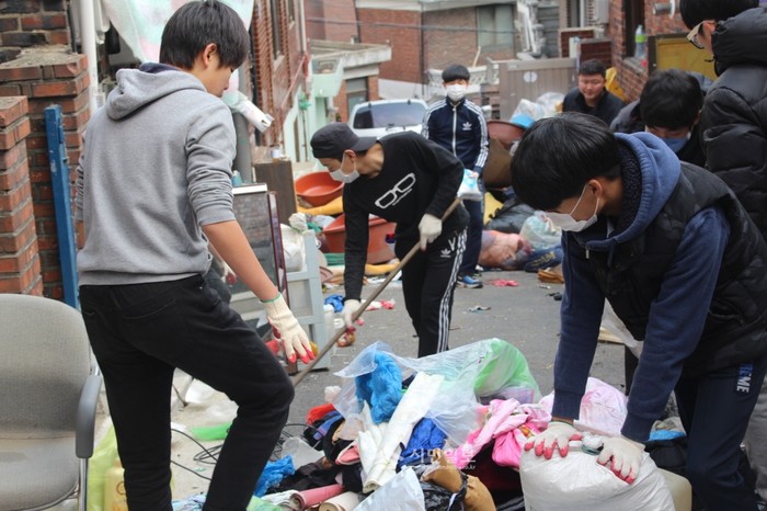 최근 서울 은평구 신사제2동 주민센터에서는 홀몸노인 집 안에 수년간 방치돼 쌓여 있는 쓰레기를 치우는 대청소를 실시했다. 사진은 봉사에 참여한 학생들이 쓰레기를 치우는 모습.(사진제공=은평구청)