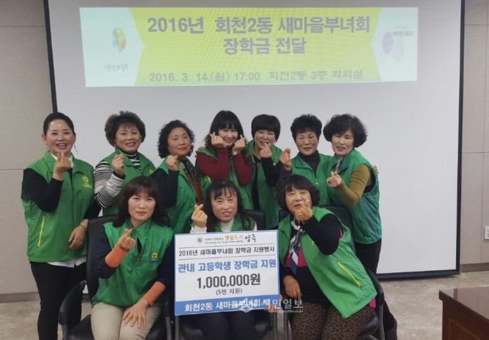 16일 경기 양주시 회천2동 새마을부녀회는 회천2동 복합청사 3층 회의실에서 지역내 저소득층 학생 5명에게 100만원 상당의 장학금을 전달했다. 사진은 관계자들이 기념촬영을 하는 모습.(사진제공=양주시청)