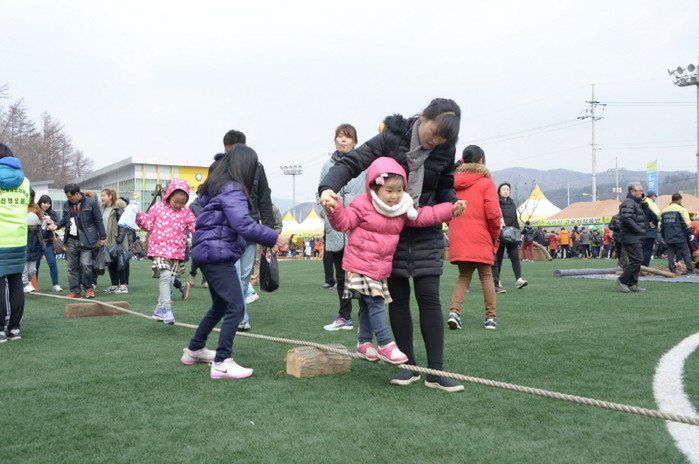 최근 경기 양평군의 대표 봄 축제인 '제17회 양평단월고로쇠축제'가 단월 레포츠공원에서 성황리에 마무리됐다. 사진은 축제에 참가한 아이들이 줄타기 체험을 하고 있는 모습.(사진제공=양평군청)