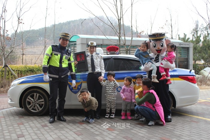 17일 인천중부경찰서는 하늘별빛어린이집을 방문해 어린이들을 대상으로 올바른 교통질서 확립을 위한 찾아가는 어린이 교통안전교육을 실시했다. 사진은 교육 후 경찰서 관계자들과 어린이들이 기념촬영을 하는 모습.(사진제공=인천중부경찰서)