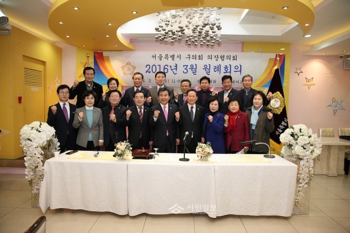 지난 16일 서울 성동구 베아르시에서 개최된 '서울시구의회의장협의회 3월 월례회의' 에 참석한 의장들이 기념촬영을 하고 있다. 이번 회의에 참석한 의장들은 오는 4월 월례회에 있을 의정대상 구의원 및 직원 표창 관련 안건에 대해 논의했다.(사진제공=강동구의회)