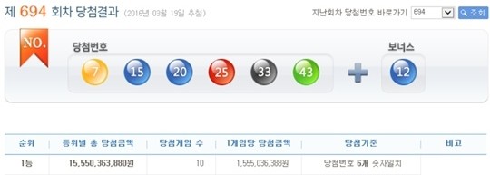 한편 19일 진행된 제694회 나눔로또 추첨에서 당첨번호는 ‘7, 15, 20, 25, 33, 43’으로 결정됐다. 보너스 번호는 ‘12’다.