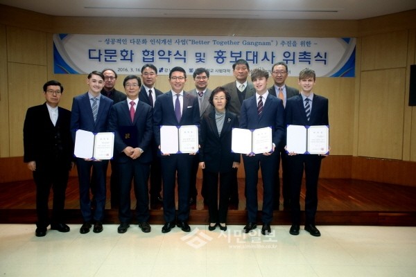 최근 서울 강남구는 서울대학교, 강남구다문화가족지원센터와 다문화 인식개선을 위한 협약을 맺고 김범수 전 아나운서 및 JTBC <비정상회담> 출연 방송인들을 홍보대사로 위촉했다.사진은 신연희 구청장(앞줄 오른쪽에서 세번째)과 관계자들이 홍보대사들과 기념촬영을 하는 모습.(사진제공=강남구청)