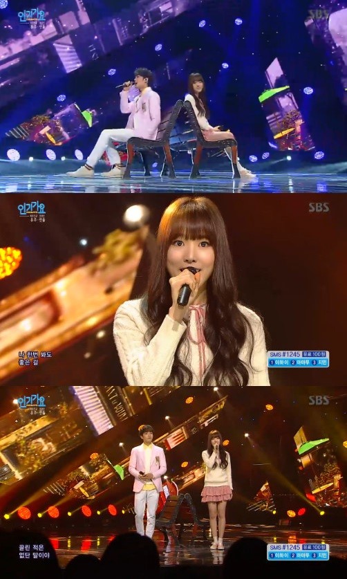 20일 오후 방송된 SBS '인기가요'에 출연한 유주와 선율은 '보일 듯 말 듯'을 열창했다.