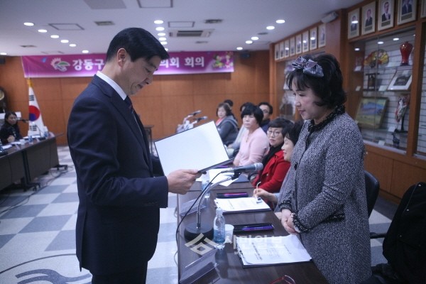 최근 이해식 서울 강동구청장(왼쪽)은 구청 소회의실에서 지역내 18개 동에 각 한명씩 아동위원협의회 위원을 위촉했다. 아동위원들은 앞으로 지역내 저소득 취약계층 아동과 위기 청소년을 보살피는 업무를 맡게 된다.(사진제공=강동구청)