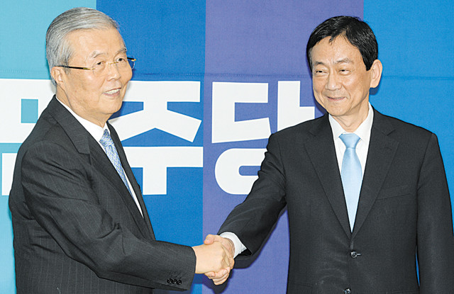 새누리당을 탈당한 진영 의원이 20일 오전 서울 여의도 국회 더불어민주당 당 대표실에서 입당을 공식화하는 기자회견을 가진뒤 김종인 비상대책위 대표와 두손을 꼭잡고 있다.