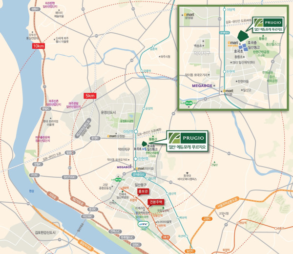 단지는 특히 일산신도시와 파주 운정신도시의 다양한 생활 인프라를 동시에 누릴 수 있다는 점이 장점이다. 이마트(덕이/운정), 덕이 로데오 거리, 두산 위브 더 제니스 등의 상업시설 이용이 쉽고, 초대형 복합단지 킨텍스와도 4km 거리에 불과하다. 일산신도시, 파주 운정신도시의 상업·관공서·문화 시설 이용과 신세계 파주 첼시 아울렛, 롯데 프리미엄 아울렛 등 쇼핑센터도 편리하게 이용할 수 있다.